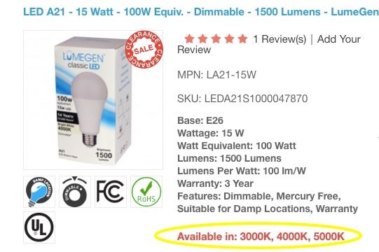 The color temperature of an LED light can be measured on the Kelvin (K) scale. Dimmer, warmer lights are lower in kelvin. Whiter, brighter, and bluer lights are higher in kelvin. Select LED bulbs are available in a range of 3,000 to 5,000 kelvin — getting brighter and cooler as the value increases. View the yellow circle in the LED bulb listing shown below to know where to look for color temperature.